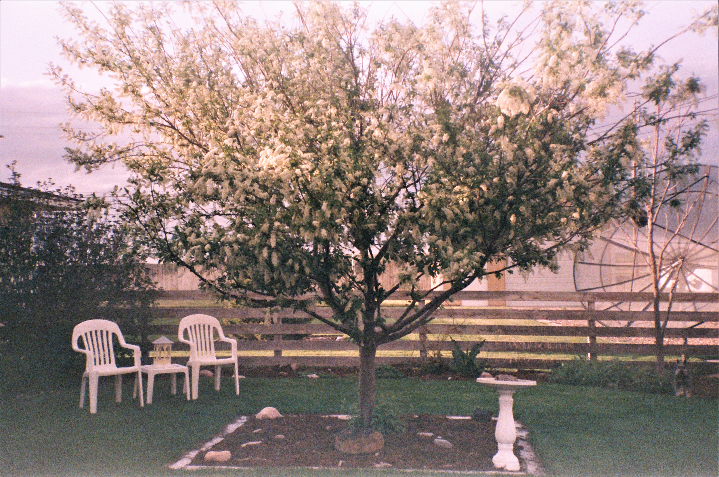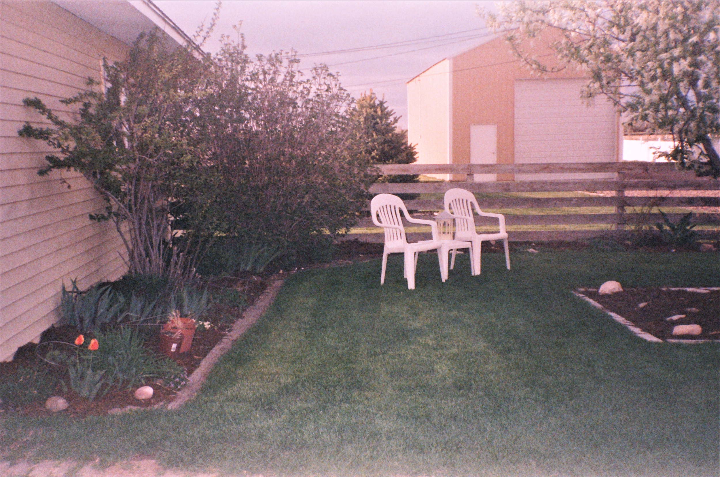 Here are key photos from the roll of Kodacolor 400 we found in this camera, with some color correction and clarity applied to counteract the dye-fading and color-shift. An accidental double-exposure (first image), backyard, front yard, and cars are included. Blurs, duds, duplicates, and boring shots of people at a garage sale in the rain were left out. These are not great or intriguing photographs, but they do provide a “slice-of-life” view of some people, place, and time…