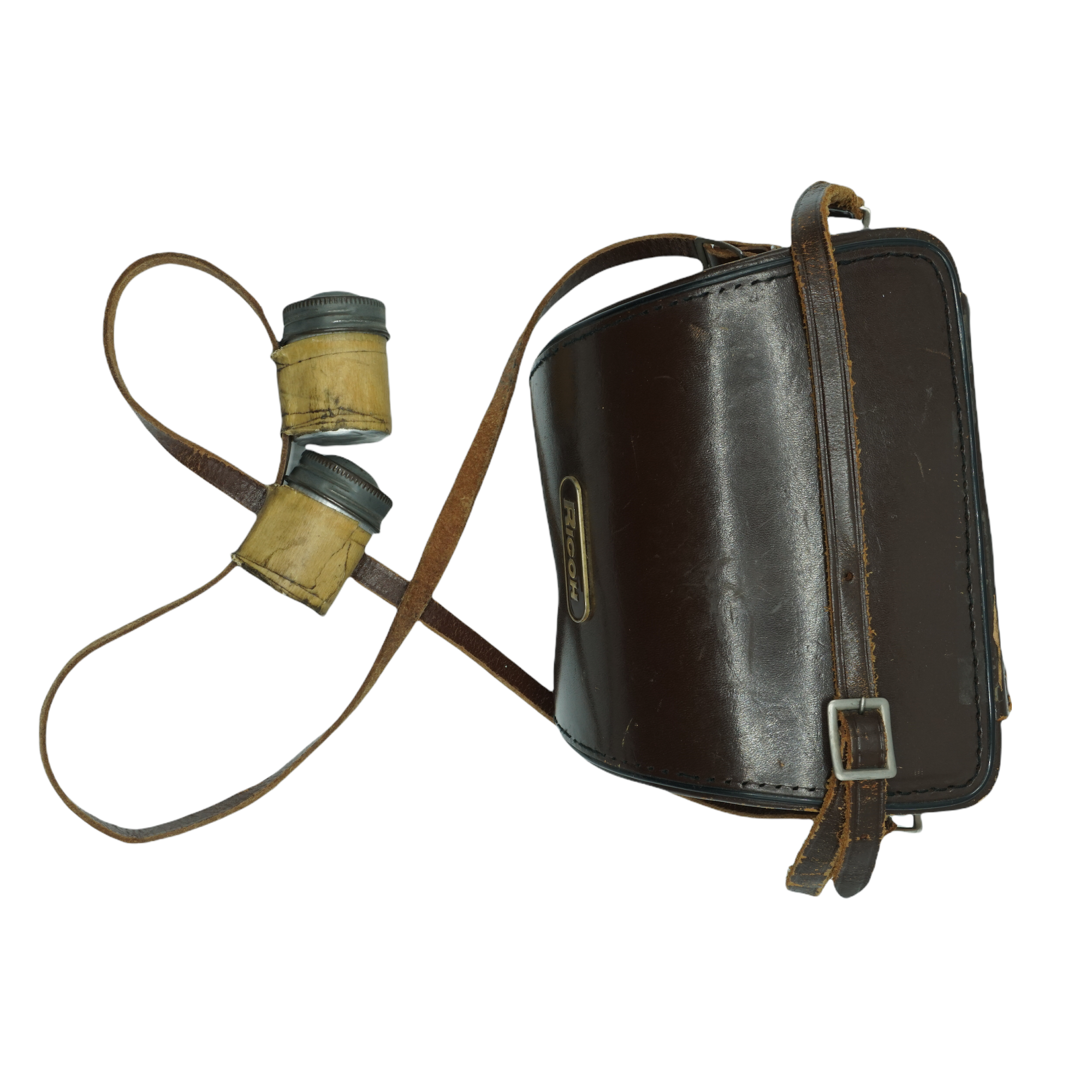 Here’s a gallery of the camera, its carrying case, and two metal film canisters (empty) attached to the neck strap with masking tape: