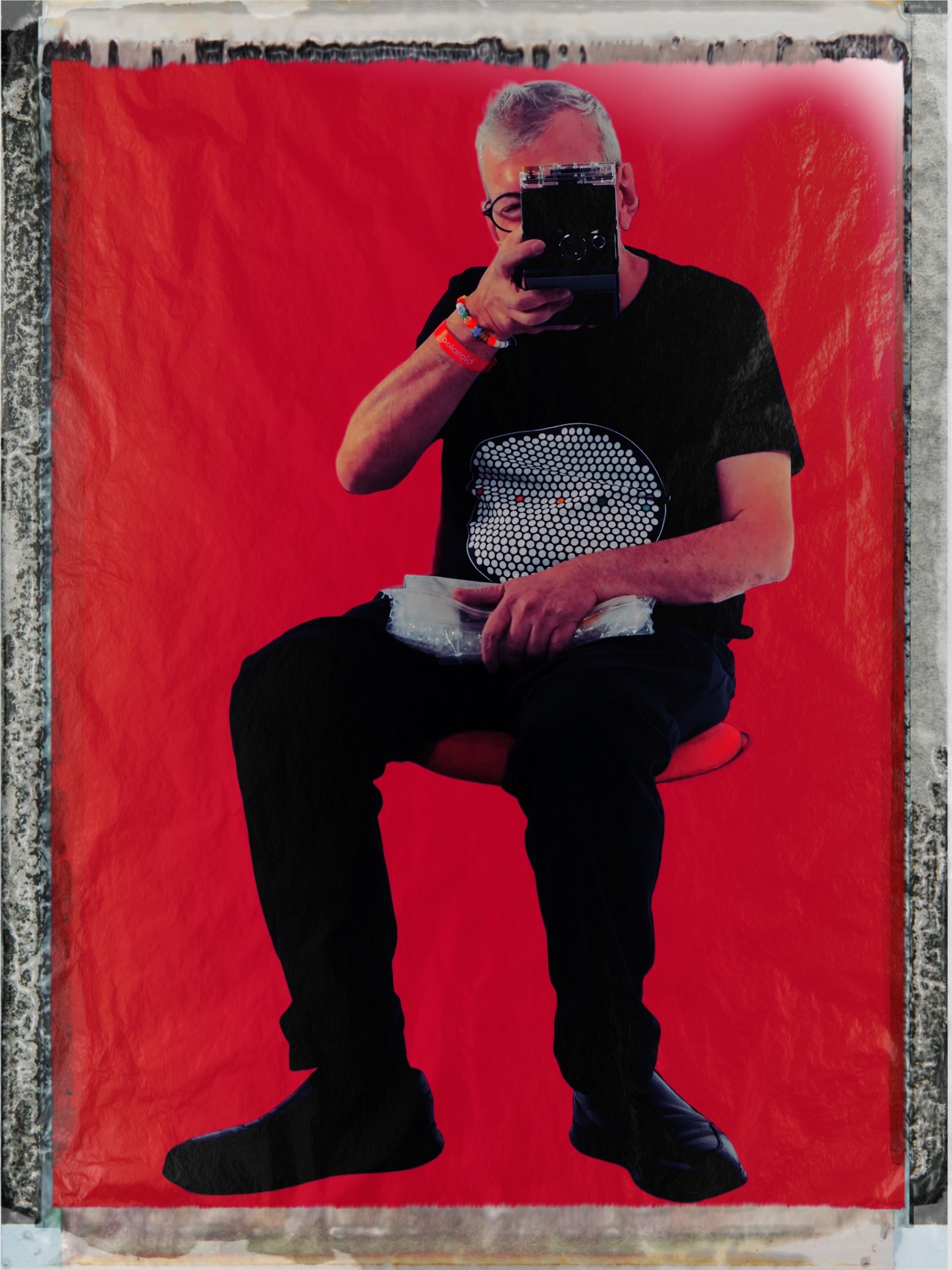 - Row 6: one of Russ Murray (me!) shot on a Hasselblad using Alin Tolea’s Instax Square instant photo back, one on Color 600 of Russ and Joaquin in a circle, and one of Joaquin posing with a woman (didn’t catch her name) wearing a vintage Kodak sweater.