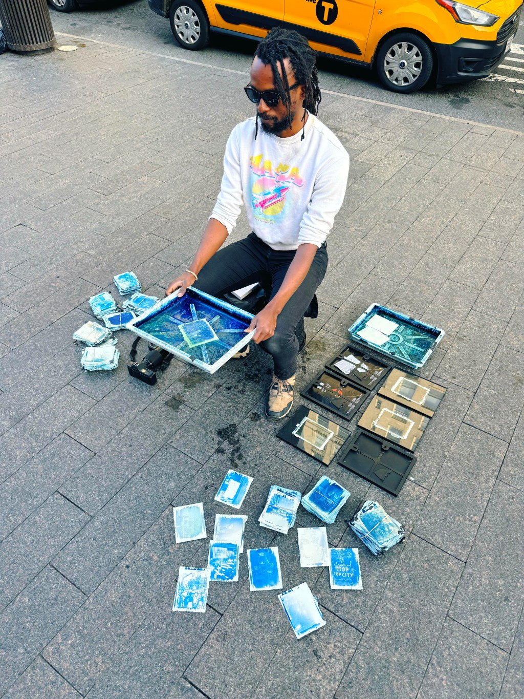 Walking out of The Metropolitan Museum of Art (“THE MET”) after being awed, amazed, and inspired by the Harlem Renaissance exhibit, we noticed a young man doing something interesting at the bottom of the stairs. From his activity, the distinctive blue color staining his developing trays and visible on the stacks of prints, I knew immediately he was making cyanotypes! I stopped to talk with him…
