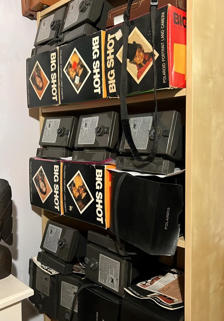 In mid-2022, a professional photographer who loves instant film posted to the Big Shot group on Facebook that he was looking for a Big Shot camera. I replied that I had lots of them in stock and he could take his pick from our Big Shot shelf shown in the photo (above).